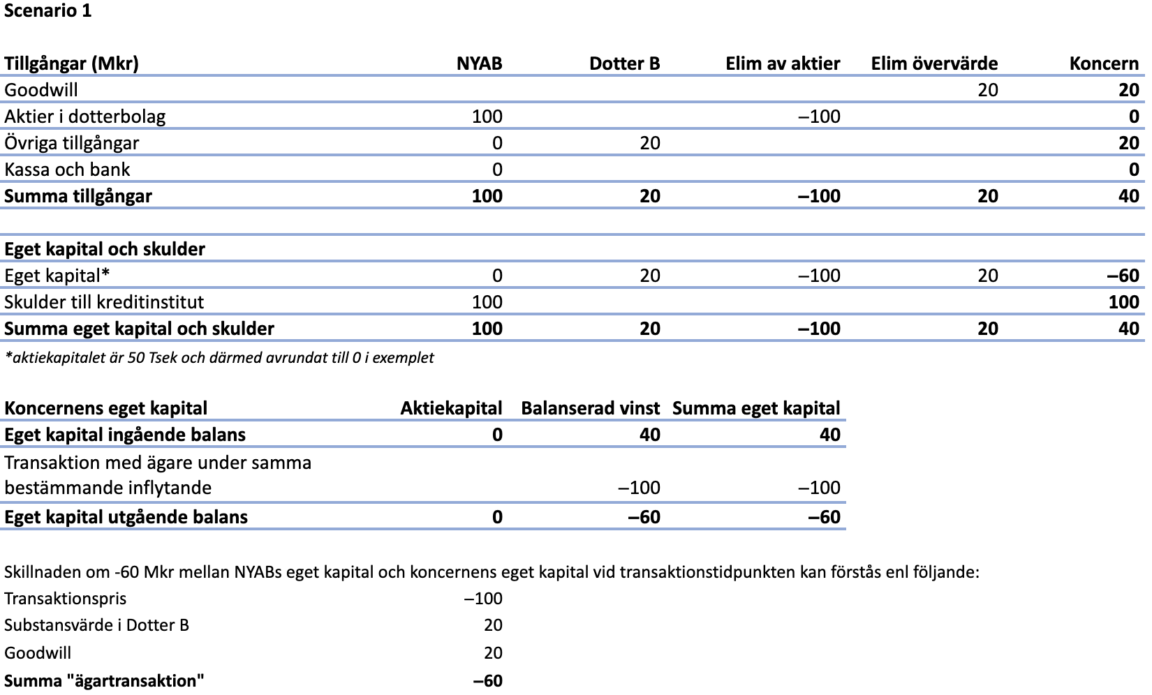 Priset om 100 Mkr som NYAB betalar för Dotter B skiljer sig således i förhållande till befintliga koncernmässiga värden som Dotter B bidrar med till A-koncernen. I ett sedvanligt rörelseförvärv hade en sådan skillnad utvärderats utifrån potentiella övervärden och därefter hade resterande belopp redovisats som goodwill. Transaktionen i fråga utgör en refinansiering kombinerat med ett förvärv mellan parter under common control. Därmed kommer beloppet mellan förvärvspriset och övertagna koncernmässiga värden i stället redovisas direkt i eget kapital som en effekt av common control-transaktionen. Detta återspeglar att transaktionen endast utgör en omallokering av kapitalet under common control där NYAB nu utgör en förlängning av det tidigare moderbolaget och dess koncernredovisning.