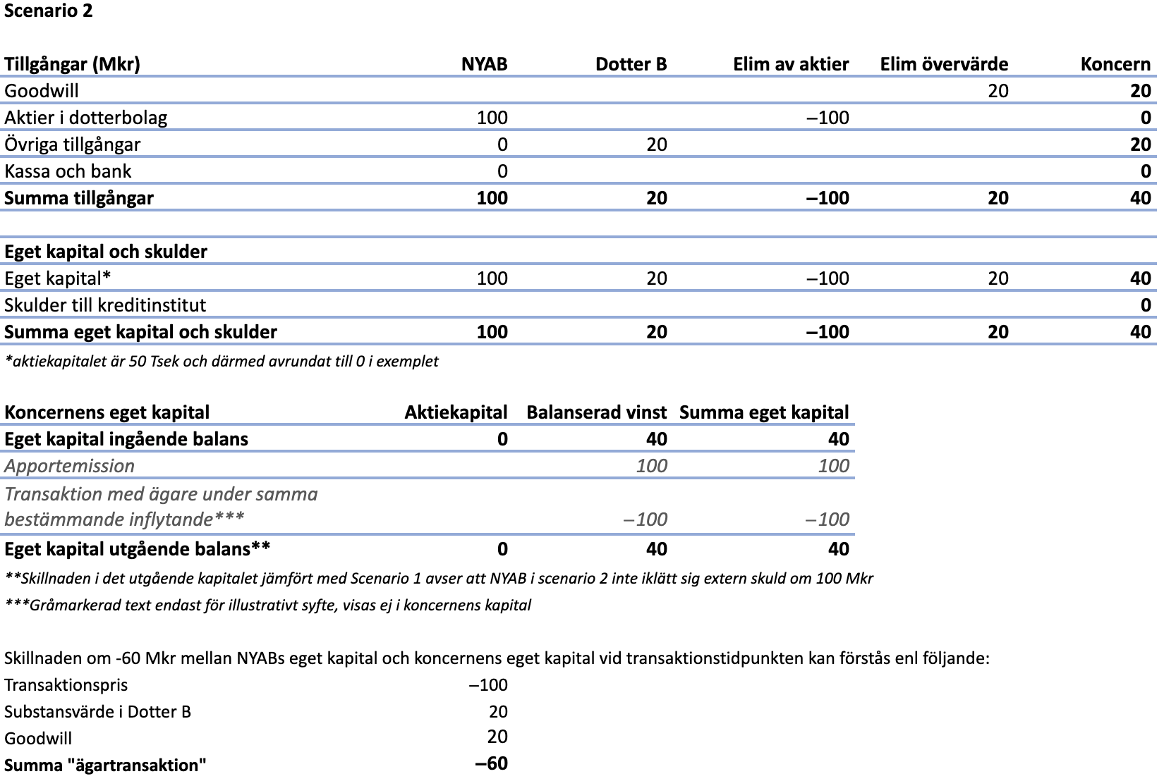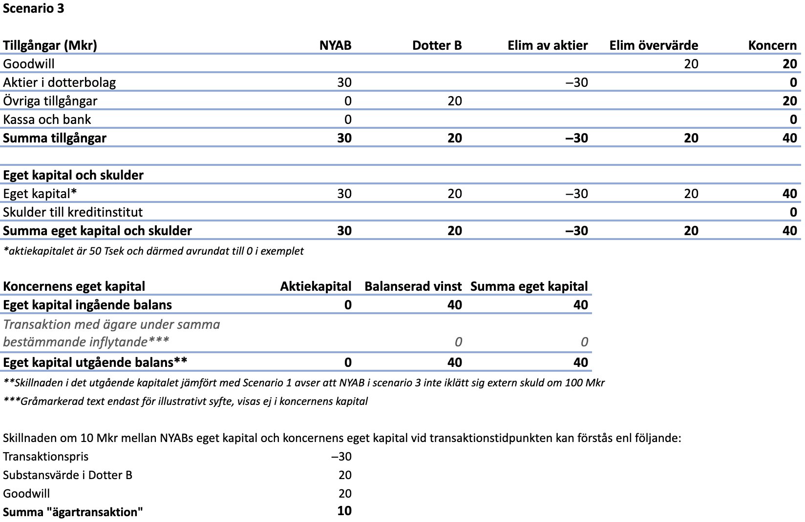[3] Notera att syftet med scenario 3 är att påvisa att det inte föreligger någon skillnad om NYAB betalar ett annat pris för aktierna än verkligt värde, i detta fall Moder A:s bokförda värde på aktierna. Scenariot kan således ändras till ett annat pris (verkligt värde, koncernmässigt värde eller annat avtalat pris) utan att detta föranleder någon förändring av koncernens ingående eller utgående eget kapital när transaktionen finansieras genom aktieägartillskott.