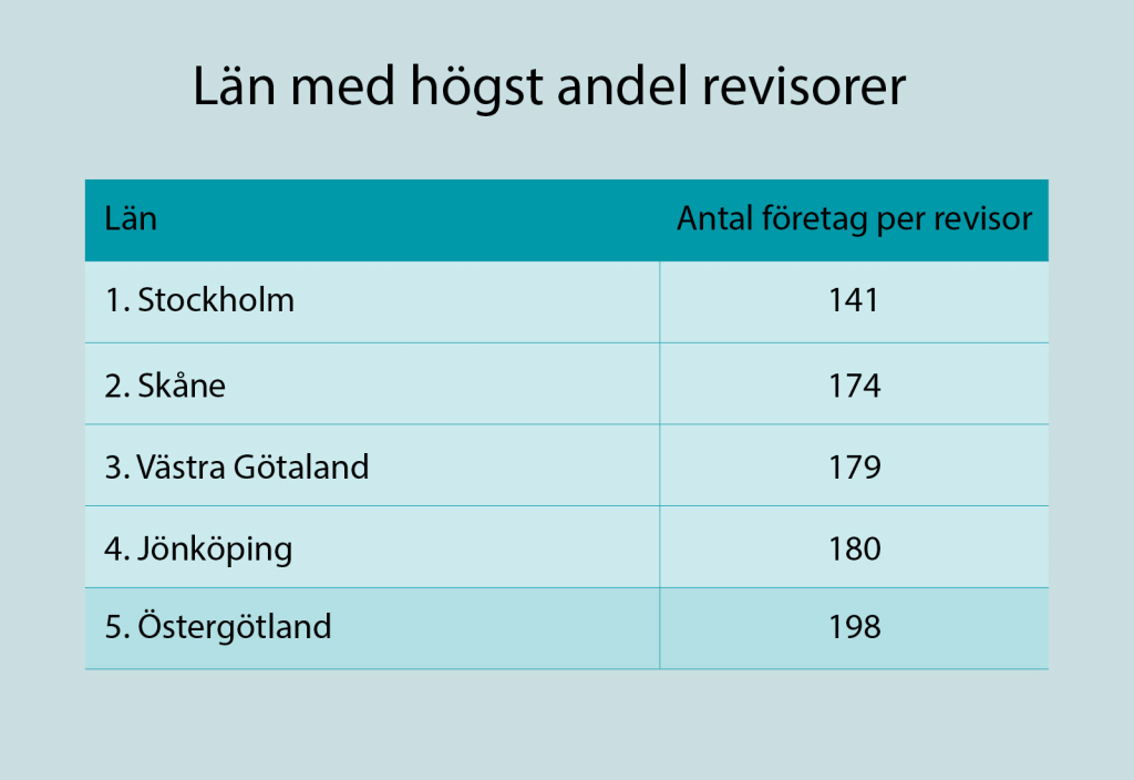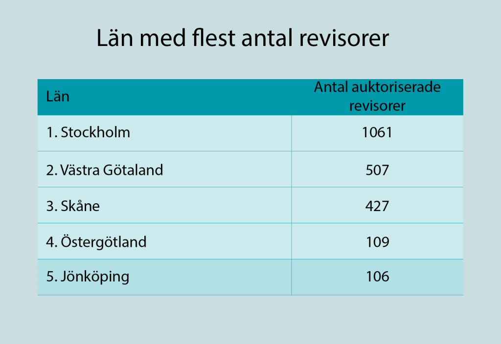 Det finns en klar överrepresentation av revisorer i Stockholm, Göteborg och Malmö, i förhållande till folkmängd och antal företag. Även många andra större orter, som Jönköping, Karlstad och Östersund, har fler revisorer än rikssnittet. Överrepresentationen kan delvis förklaras av att det finns fler stora företag och koncerner i storstäderna, inklusive många börsnoterade bolag.