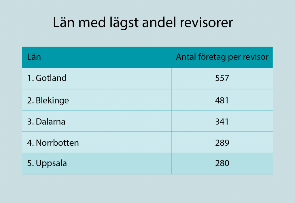 Samtidigt visar statistiken en tydlig underrepresentation i vissa län. Gotland, Blekinge och Dalarna har lägst andel revisorer i förhållande till antal företag, och även Norrbotten och Kronoberg ligger klart under rikssnittet. Flera revisionsbyråer på mindre orter vittnar också om stora svårigheter att rekrytera och behålla medarbetare.