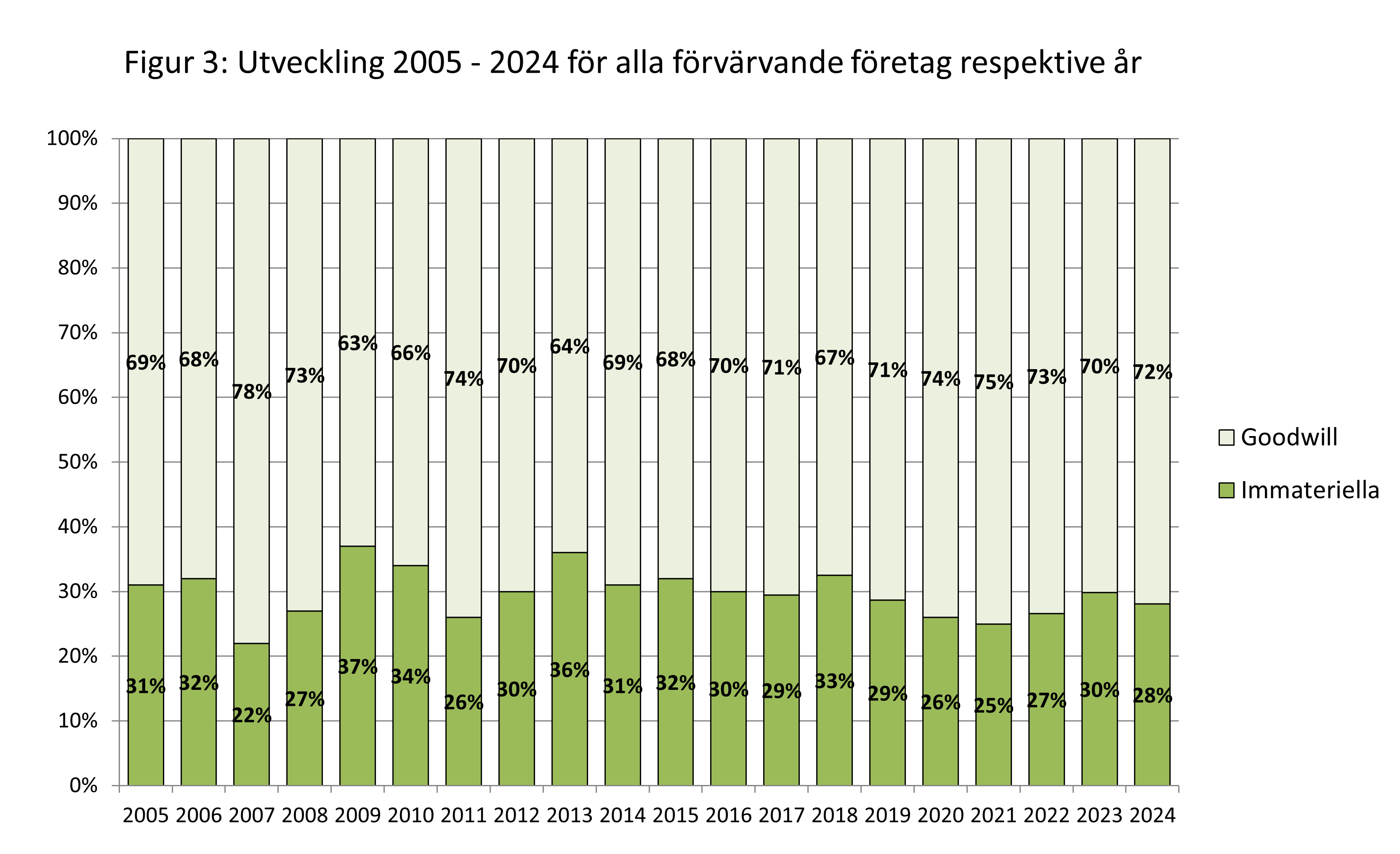 De tre tillgångskategorierna finansiella och materiella tillgångar, immateriella tillgångar och tillgången goodwill, beloppen enligt förvärvsanalyserna, relaterar vi till summan av dessa tillgångar. På så sätt undviks att statistiken påverkas av skuldsättningsgraden i förvärven och därmed den relativa köpeskillingen. Hela tiden är vi främst intresserade av identifieringen av immateriella tillgångar, och därmed goodwill som den resterande delen.