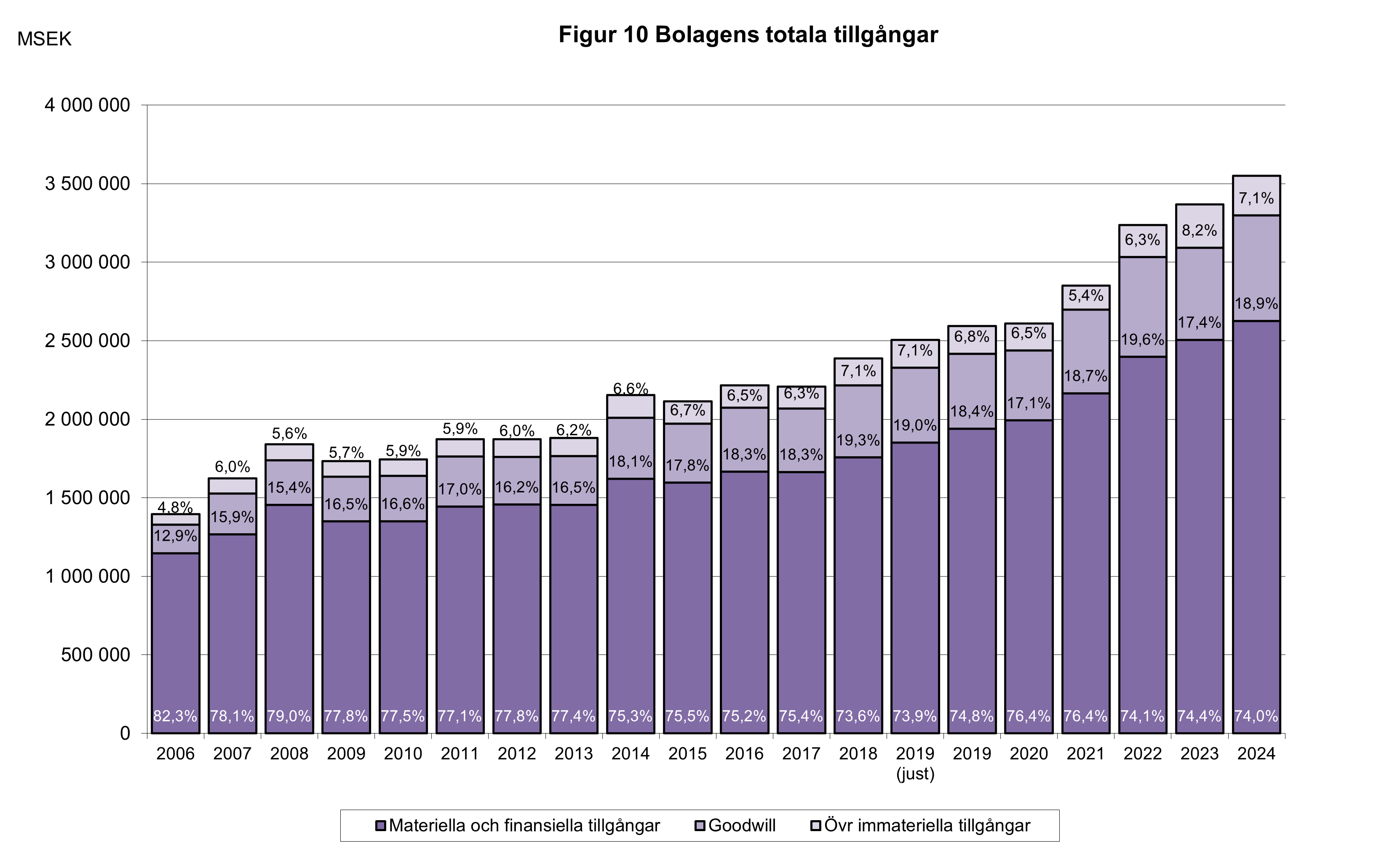 I utvecklingen av de tre tillgångskategoriernas andelar i de 24 företagen syns en stor ökning i den relativa summan av andelarna goodwill och immateriella tillgångar från knappt 18 % 2006 till en platå på först 22 à 23 % 2007-2013 och sedan 24 à 26 % till och med 2019 (just). För åren från och med 2019 är goodwill och immateriella tillgångar 2022, 2023 och 2024 kvar på nivån 2019, men noterbart är att medan goodwill 2023 minskade med drygt 2 procentenheter, och immateriella tillgångar ökade med drygt 2 procentenheter, så ökade goodwill 2024 med 1,5 procentenheter, och minskade immateriella tillgångar med 1,1 procentenheter. Minskningen av goodwill 2023 berodde inte minst på Ericssons stora nedskrivning det året, med 32 miljarder.