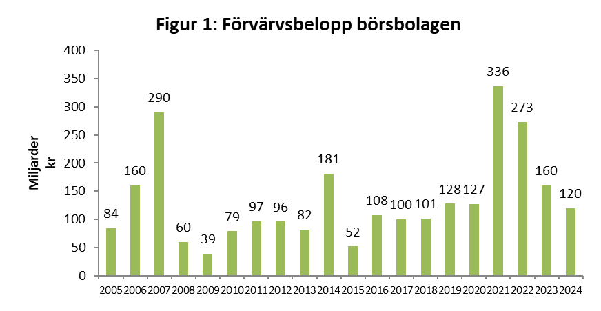 Det totala förvärvsbeloppet blev 2024 cirka 120 miljarder, ännu en minskning efter den enorma ökningen 2021, vilket innebär att det totala förvärvsbeloppet 2024 är en dryg tredjedel av beloppet 2021. Därför landar 2024 på niondeplats sett under alla 20 åren, men man måste samtidigt betänka penningvärdets fall under så många år. För även de tidigare åren se figur 1.