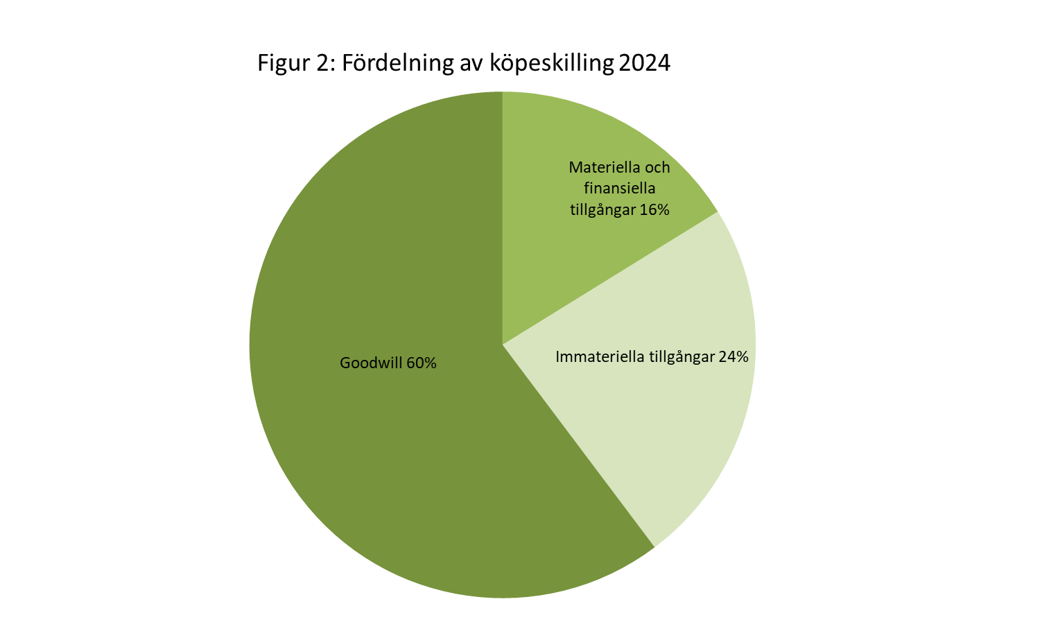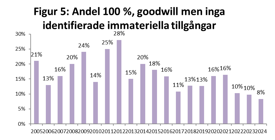 Alltså redovisade 8 förvärvare 2024 (det vill säga 8,6 %) goodwill men ej alls några identifierade immateriella tillgångar. Tre förvärvare hade netto av förvärvade tillgångar (materiella, finansiella och immateriella) och övertagna skulder som precis motsvarade köpeskillingen och fick därmed inte någon goodwill.
