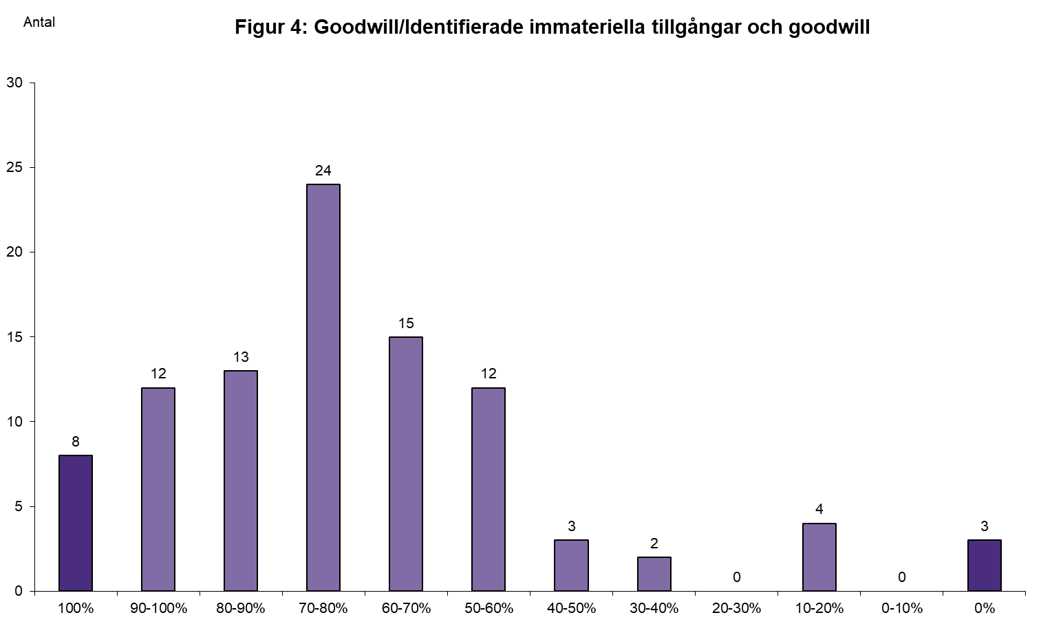 Ett annat sätt som vi analyserar förvärven på är relationen mellan å ena sidan goodwillvärdet och å den andra totalt värde på identifierade immateriella tillgångar och goodwill. Av de 98 förvärvarna 2024 har vi grupperat 96 i respektive tioprocentsintervall (figur 4). 2 företag med enbart finansiella och materiella tillgångar är ej med.