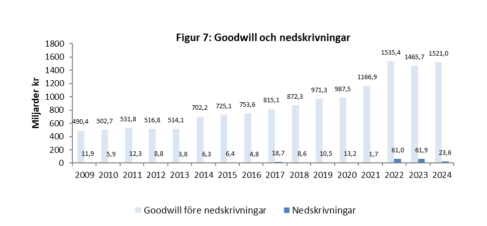 Vid sidan av identifieringen av immateriella tillgångar, vid första redovisningen, riktas även uppmärksamhet på efterföljande redovisning av goodwill. Nedskrivningsnivån exklusive de tre med höga nedskrivningar var 2024 fortsatt låg. Författarna oroas därför även denna gång över vad som framstår som godtyckligt agerande i många av företagen när det kommer till goodwill och att detta inte ifrågasätts av revisorer i allmänhet, eller av Nämnden för svensk redovisningstillsyn.