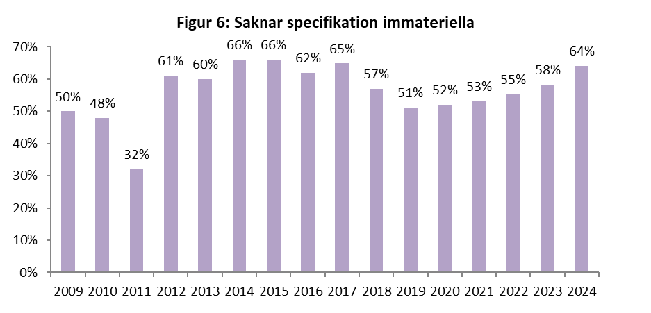 Vi ser att det negativa trendbrottet efter 2018 (figur 6), vad gäller att specificera vilka immateriella tillgångar som identifierats, fortsatte också 2024, hela sex procentenheter sämre än 2023 och det fjärde sämsta sedan 2009. Rekordåren var 2009 och 2010, då endast ungefär hälften inte specificerade, och allra bäst 2011 med en knapp tredjedel. Under 2024 var det 56 utav 88 företag med immateriella tillgångar (dvs. 64 %) som ej närmare specificerade vad förvärvade immateriella tillgångar bestod av och hur det verkliga värdet för immateriella tillgångar fördelade sig mellan de olika beståndsdelarna. Dessa 56 angav alltså i noten enbart att immateriella tillgångar identifierats och dessas totala verkliga värde.