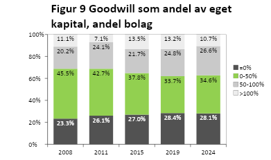Beloppet av goodwill i förhållande till företagets eget kapital kan också analyseras (figur 9). Vid en jämförelse mellan 2024 och Björn Gauffins och Anders Thörnstens undersökning av 2008[8] framgår att andelen företag där goodwillposten motsvarar mer än koncernens egna kapital visserligen är nästan oförändrad, men andelen där goodwill motsvarar mellan 50 och 100 % av eget kapital har ökat kraftigt, med nästan 7 procentenheter. Då andelen med ingen goodwill alls är 4,8 procentenheter större än 2008 så har andelen där goodwill motsvarar mellan 0 och 50 % av det egna kapitalet minskat kraftigt, från 45,5 % 2008 till 34,6 %. Andelarna där goodwill motsvarar mellan 50 och 100 % och mellan 0 och 50 % av det egna kapitalet ökade respektive minskade även från 2023 till 2024. Alltså ökar företagens exponering allmänt för goodwillposten.