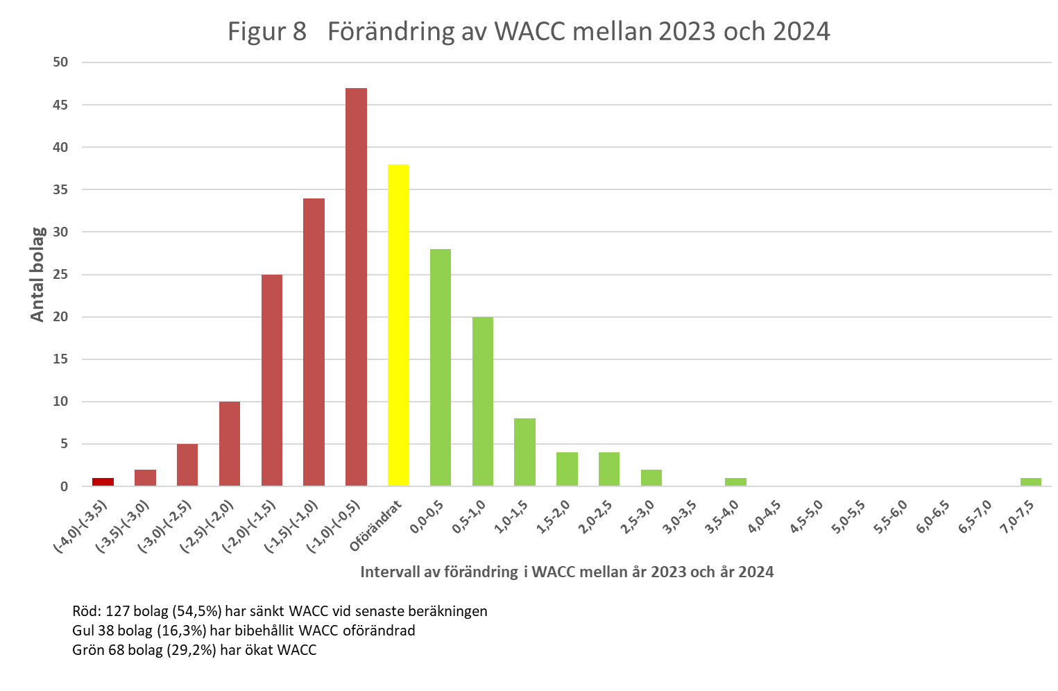 I figur 8 har vi grupperat företagen utifrån förändringen av WACC (Weighted Average Capital Cost) mellan 2023 och 2024. (För de företag som använde flera olika WACC har vi använt ett genomsnitt av dessa.) Figuren visar därtill att många företag antingen sänkte avkastningskravet från 2023 till 2024 (hela 125 av 231 företag eller 54 %) eller bibehöll samma nivå (39 företag eller 17 %). Av dem som sänkte är det mycket få som kommenterade sin förändring av avkastningskravet.